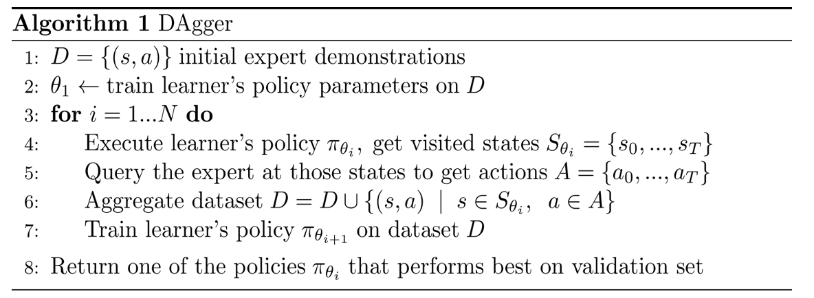 (Ross & Gordon & Bagnell, 2011): DAgger, or Dataset Aggregation