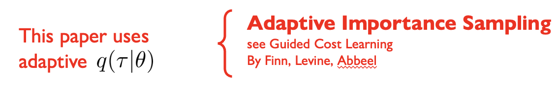 \[ \begin{align} Z(\theta) &= \sum_{\tau} \exp(-c_{\theta}(\tau)) \\ &= \sum_{\tau} \exp(-c_{\theta}(\tau)) \\ &= \sum_{\tau} \frac{q(\tau|\theta)}{q(\tau|\theta)} \exp(-c_{\theta}(\tau)) \\ &= \mathbb{E}_{\tau \sim q(\tau|\theta)} \left[ \frac{\exp(-c_{\theta}(\tau))}{q(\tau|\theta)} \right] \end{align} \]