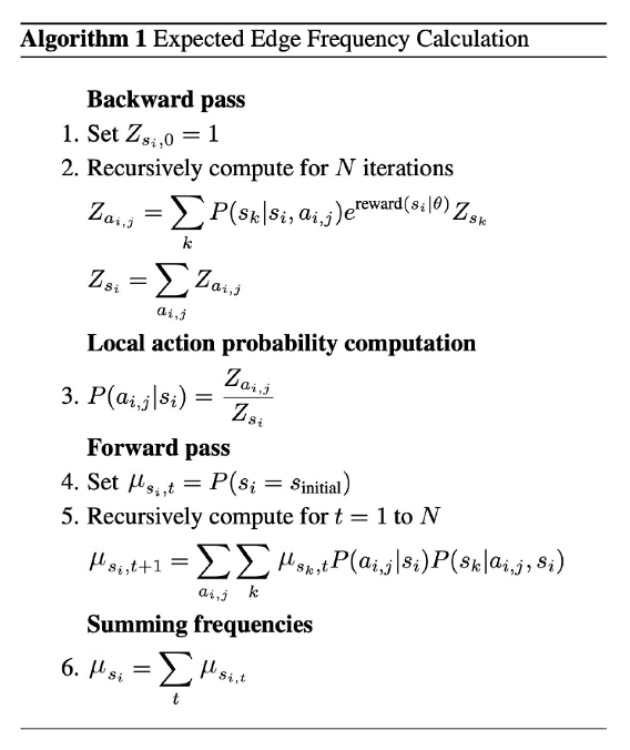 \[ p(\tau|\theta) = \frac{\exp(\theta^{\top}\mathbf{f}_{\tau})}{Z(\theta)} \qquad \begin{cases} \underset{p(\tau|\theta)}{\text{argmax}} \, \mathcal{H}(p) \\[0.5em] \text{subject to} & \sum_{\tau} p(\tau|\theta) = 1 \\[0.5em] & \mathbb{E}_{\tau \sim p(\tau|\theta)}[\mathbf{f}_{\tau}] = \frac{1}{|D|} \sum_{\tau \in D} \mathbf{f}_{\tau} \end{cases} \]