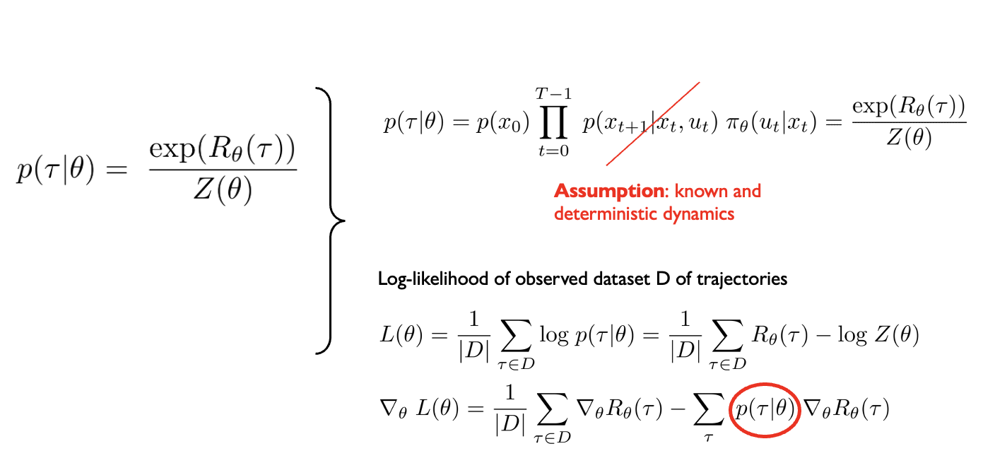 \(p(\tau|\theta) = p(x_0) \prod_{t=0}^{T-1} \underbrace{p(x_{t+1}|x_t, u_t)} \pi_{\theta}(u_t|x_t) = \frac{\exp(-c_{\theta}(\tau))}{Z(\theta)}\)