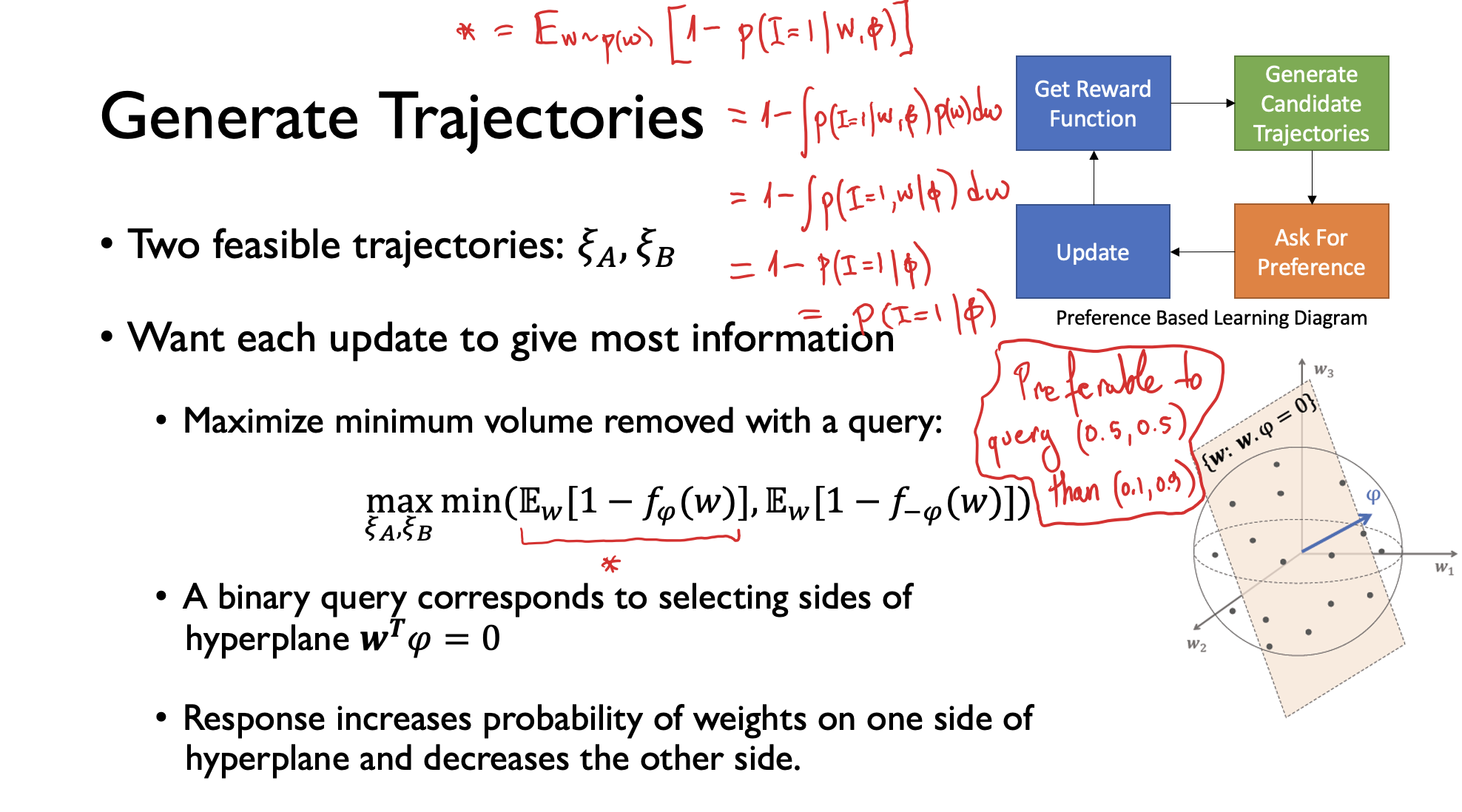 A binary query corresponds to selecting sides of hyperplane \(𝒘^𝑻 𝜑=0\)