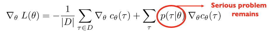 \[ \nabla_{\theta} L(\theta) = -\frac{1}{|D|} \sum_{\tau \in D} \nabla_{\theta} c_{\theta}(\tau) + \underbrace{\sum_{\tau} p(\tau \mid \theta) \nabla_{\theta} c_{\theta}(\tau)} \]