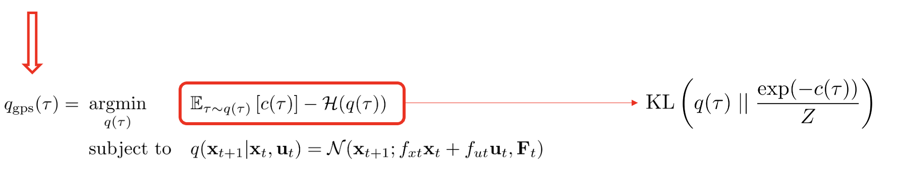 \(q_{\text{gps}}(\tau) = \underset{q(\tau)}{\text{argmin}} \quad \mathbb{E}_{\tau \sim q(\tau)}[c(\tau)] - \mathcal{H}(q(\tau))\)