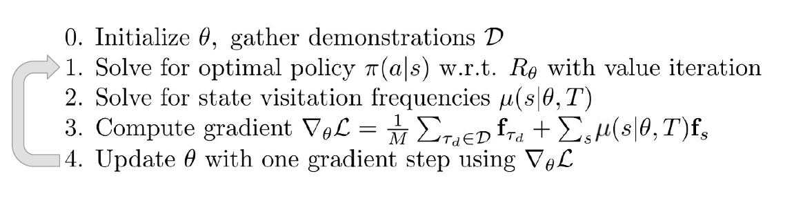 As we have seen, maximizing the entropy subject to the feature counts constraint is equivalent to maximize the likelihood of the demonstrated trajectories D with an exponential family as our path distribution: \[ \theta^{*} = \arg\max_{\theta} L(\theta) = \arg\max_{\theta} \sum_{\tilde{\tau} \in D} \log P(\tilde{\tau} \mid \theta, T) \]