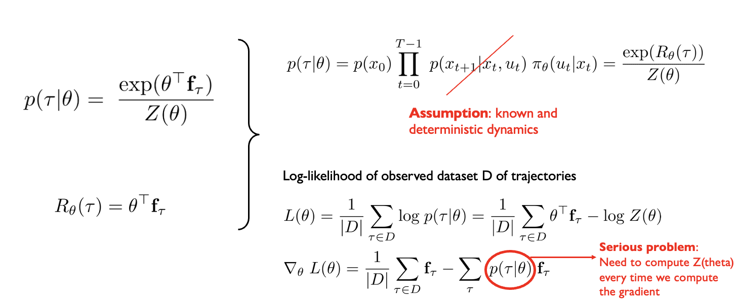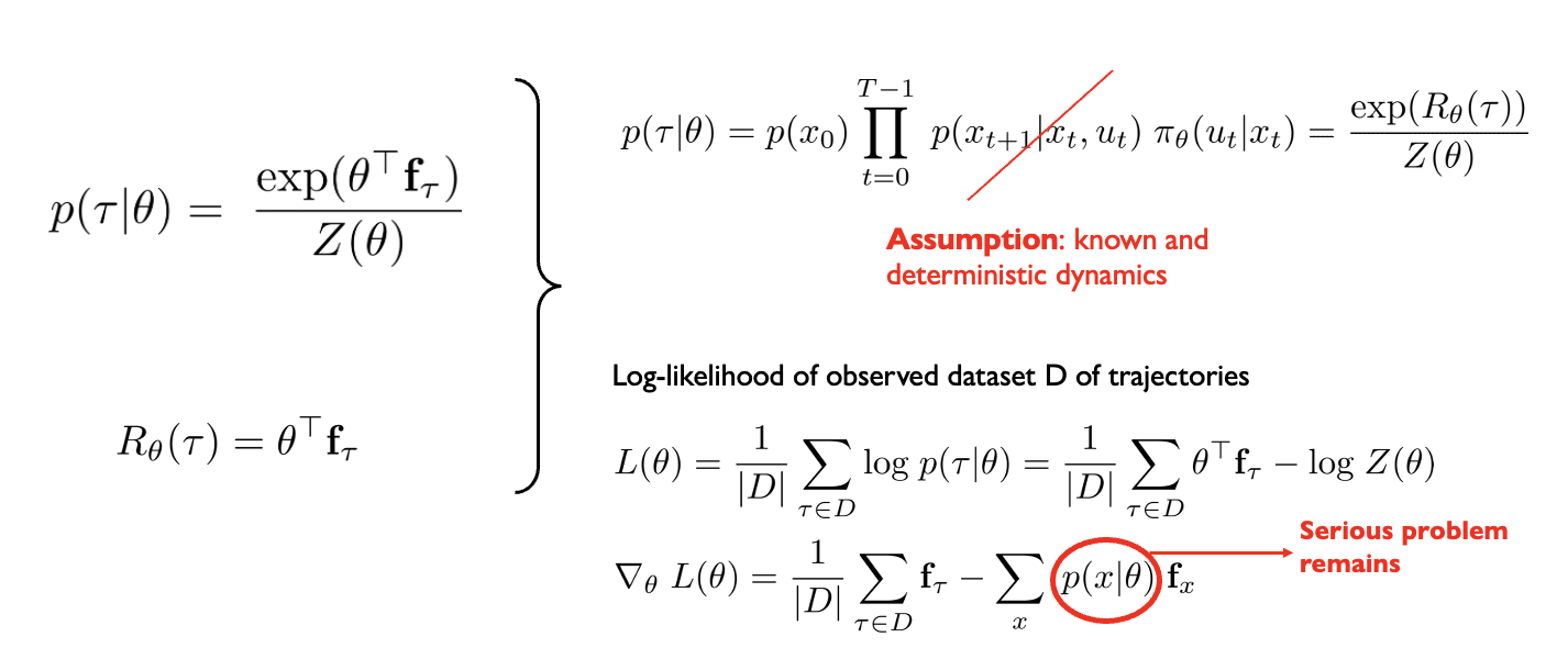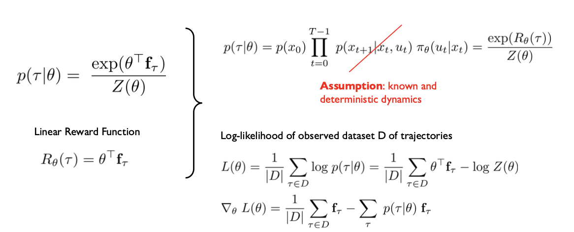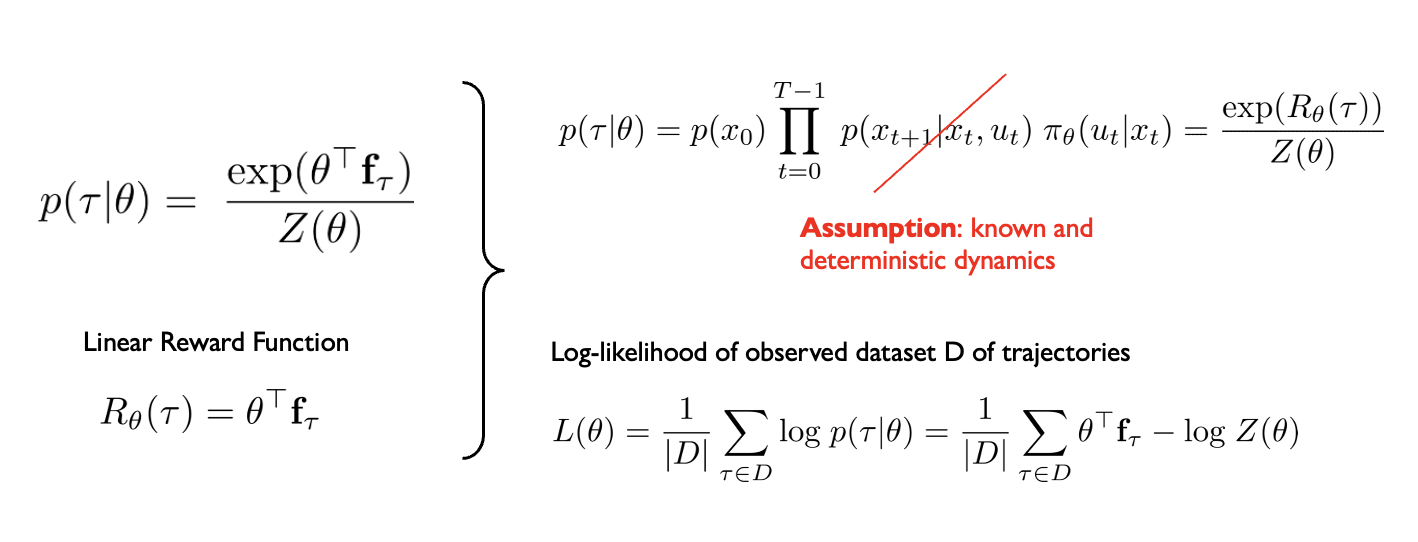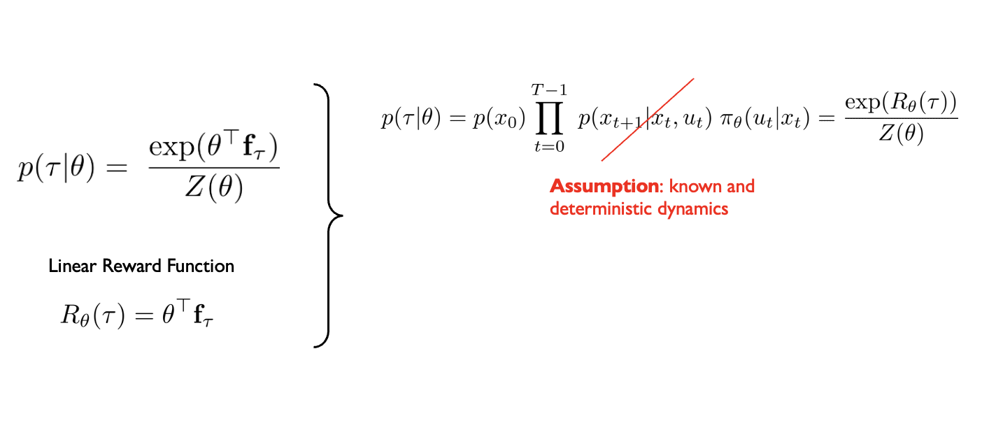 \[ \left. \begin{aligned} p(\tau \mid \theta) &= \frac{\exp\!\bigl(\theta^\top \mathbf{f}_\tau\bigr)}{Z(\theta)} \\[8pt] \textbf{Linear Reward Function}\\ R_\theta(\tau) &= \theta^\top \mathbf{f}_\tau \end{aligned} \right\} \qquad p(\tau \mid \theta) \;=\; p(x_0)\, \prod_{t=0}^{T-1} p(x_{t+1}\!\mid\!x_t,u_t)\,\pi_\theta(u_t\!\mid\!x_t) \;=\; \frac{\exp\!\bigl(R_\theta(\tau)\bigr)}{Z(\theta)} \]